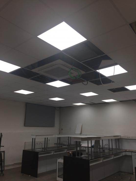 I no hi tornem per estudiar-hi anglès, tot i que hauríem de fer-ho, sinó per fer-hi una reforma interior. Ja vam treballar a l'American School l'estiu passat, i ara, aprofitant de nou que els alumnes estan de vacances, hi hem tornat per realitzar-hi un canvi de paviment, la climatització de les plantes P0-P2 i la col·locació d’un túnel de rentat a la cuina.