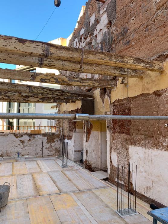 Estamos trabajando en la construcción de un edificio plurifamiliar entre medianeras en la C/ Raval Montserrat de Terrassa y actualmente estamos en fase de estructura. Este edificio contará con tres plantas. En la planta baja se encontrará el acceso al edificio y los dos locales comerciales. En la planta primera habrá una vivienda que dispondrá de un espacio de salón-comedor-cocina, tres dormitorios, dos baños y un lavadero. Y en la planta segunda encontraremos dos viviendas comunicadas con la planta bajo cubierta que dispondrán de salón-comedor-cocina, dos habitaciones, dos baños y terraza. El proyecto es de los arquitectos Joan Carbo Seriñana y Josep Mª Sunyer Deu y está liderado por Alberto Camenforte como jefe de obra y José Ceballos como encargado.